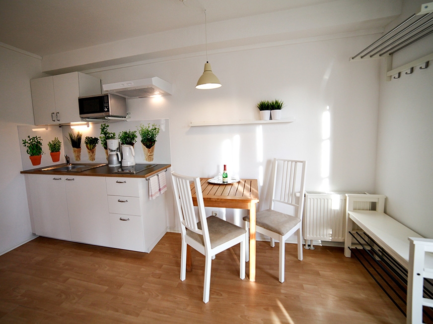 Unsere Küchenzeilen sind über eine Mikrowelle mit Grillfunktion, einem Kühlschrank mit Gefrierfach, einem 2 Platten Ceranfeld, einem Wasserkocher bis hin zum Toaster & Kaffeeaufbereiter ausgestattet. Gerne halten wir auf Anfrage eine Kaffeemaschine für Sie bereit. Ebenso sind Geschirr & Besteck sowie Kochutensilien vorhanden.
