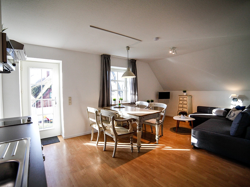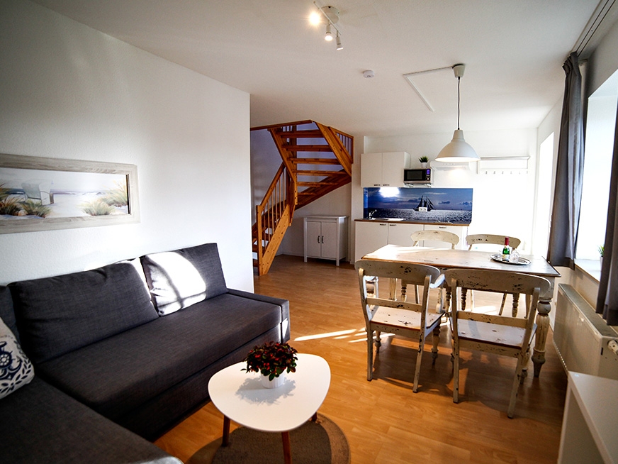 Unsere Maisonette-Apartments im maritimen Flair sind Nichtraucher- Apartments und eignen sich für max. 5 Personen. Sie befinden sich in der 1.Etage und sind durch eine Außentreppe erreichbar. Beim Betreten des Apartments befinden Sie sich in einem gemütlichen Wohnraum mit Schlafsofa (140x200).