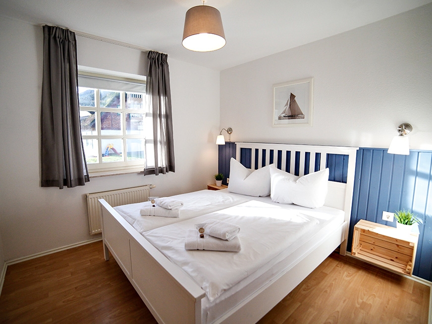 Ergänzt wird dieser Bereich durch eine Küchenzeile & Esstisch. Ebenso befindet sich das Tageslichtbadezimmer auf dieser Ebene. Durch eine Innentreppe gelangen Sie zu einem zum Träumen einladenden Schlafzimmer mit Doppelbett. Davor befindet sich in einer Nische eine zusätzliche Schlafgelegenheit, welche wir als "Piratenkoje" bezeichnen. Bitte beachten Sie die Länge der Piratenkoje (1,85m).
